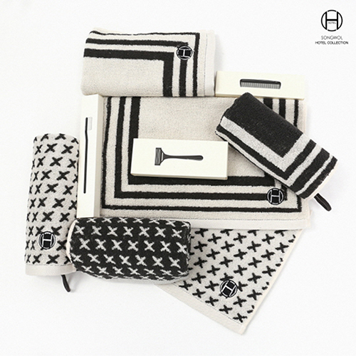 세련된 느낌을 주는 x패턴에 고급스러운 호텔 컬렉션 자수가 포인트로 들어간 고리수건으로 넉넉한 사이즈로 실용적이며 시크하고 세련된 색감으로 선물용으로도 적합합니다.